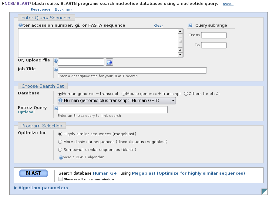 El más importante de ellos es la secuencia que queremos utilizar en la búsqueda (Enter Query Sequence). Podemos poner una secuencia en formato fasta o un número de acceso de la Genbank. Además podemos limitar la búsqueda a una región concreta de la secuencia (Query subrange). El formulario nos permite también escoger un fichero que contenga la secuencia.