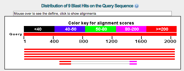 A continuación aparecen una figura y una tabla con un resumen de los resultados. En la figura se observa una fila para cada una de las secuencias similares obtenidas (hit). En cada fila se representa la región cubierta por los distintos HSPs. Estas regiones están pintadas de un color u otro dependiendo del E-value correspondiente.