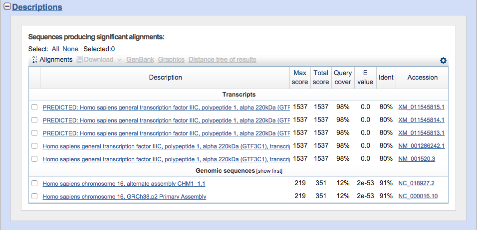 En la tabla también se encuentran los distintos resultados (hits). Para cada uno se puede observar la definición de la secuencia (description) y el E-value. En la tabla los hits están ordenados por el E-value, de menor a mayor.