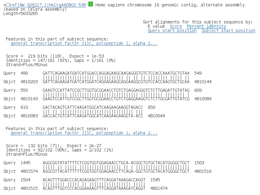 En la siguiente sección de la página de resultados se muestran los alineamientos de la secuencia problema (query) con las distintas secuencias de la base de datos (Sbjct). Para cada una de ellas se muestra la descripción y los alineamientos correspondientes a los distintos HSPs.