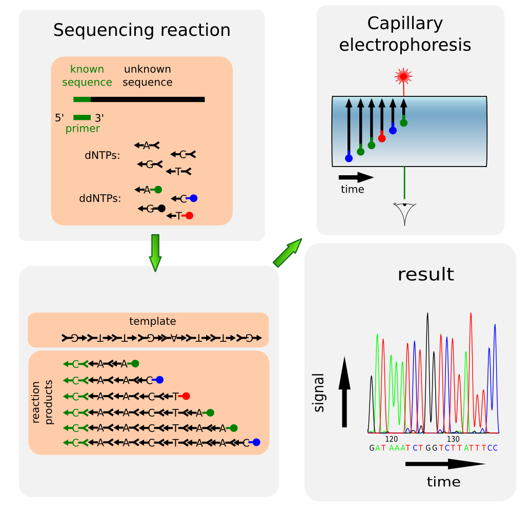 La secuenciación de Sanger se basa en la polimerización del ADN y el uso de dideoxinucleótidos que sirven como terminadores de la reacción. En la actualidad la reacción de secuenciación se basa en una modificación de la PCR con dideoxinucleótidos marcados con fluoróforos y se resuelve mediante una electroforesis capilar. El sistema más utilizado es el desarrollado por Applied Biosystems . Podéis encontrar numerosos documentos sobre la secuenciación de Sanger, pero para comenzar esta entrada de la wikipedia .