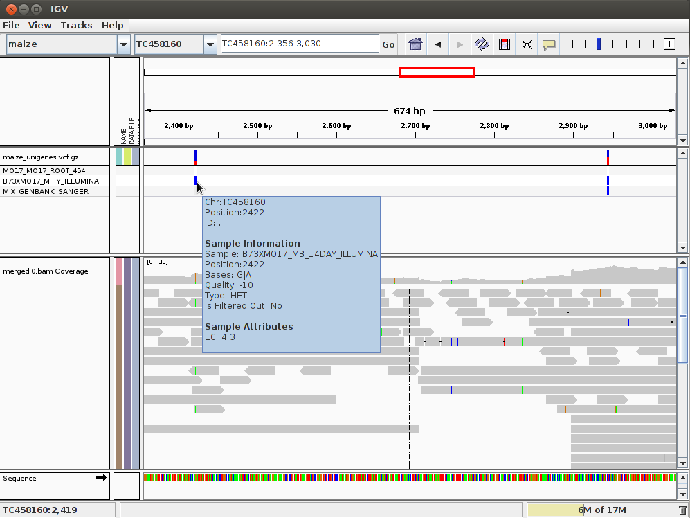 In the IGV we can load the BAM, GFF and the VCF files. In that way we can compare the mapping with the annotation. To do it, open IGV and load the BAM file from the mapping subdirectory. This time you won’t need to import the reference genome, it will be automatically selected, because it was the last reference used. Load the BAM file as you did the last time. Also load the compressed and indexed VCF file in annotation/features/ (you could sort and index the vcf file with an IGV tool). Now you should have two tracks in IGV, one with the mapping and another one with the SNP annotation. We could also load the GFF file with all the annotations, such us SSRs, ORFs, etc. In this case the GFF and VCF tracks would show similar annotation.